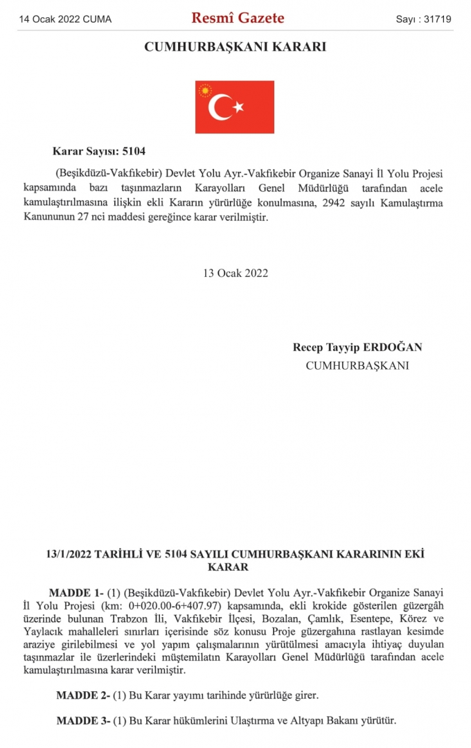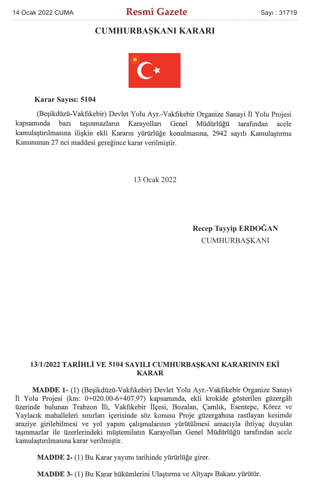 Cumhurbaşkanı tarafından imzalanan “Vakfıkebir Organize Sanayi İl Yolu Projesi Kapsamında Bazı Taşınmazların Karayolları Genel Müdürlüğü Tarafından Acele Kamulaştırılması Hakkında Karar (Karar Sayısı: 5104)” 14/01/2022 tarihli ve 31719 sayılı Resmi gazetede yayımlanarak yürürlüğe girmiştir.